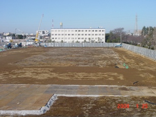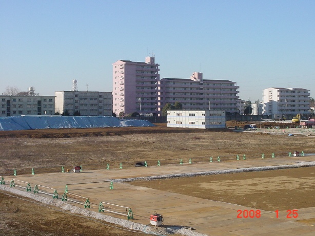 | 2008.2.23 2号棟(北側)の駐車場を作るために、鉄板を敷き始めていました。 東側、2階の建物より撮影。 |