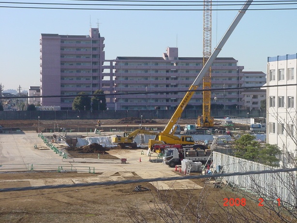 | 2008.2.1 現場北側、3階より。西側駐車場の工事の眺め。 奥のピンクの建物は県営住宅。 |
