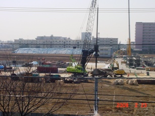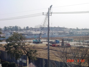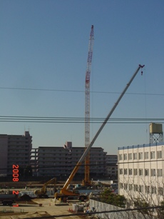 | 2008.2.1 クレーンの高さは何メートルだ? 手前右側はジェ○ス社宅4階建て。 |