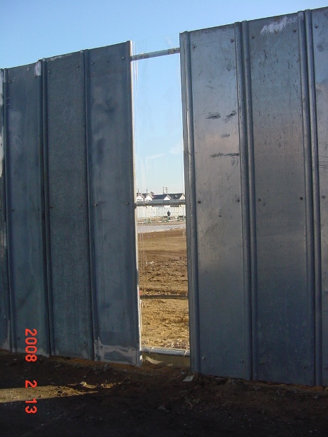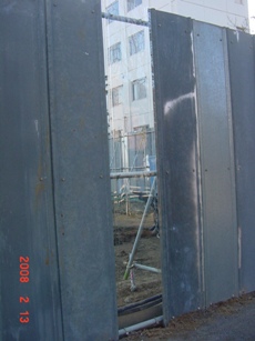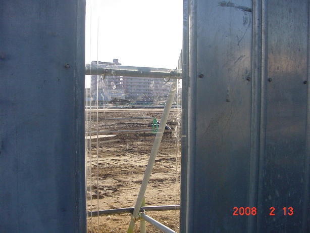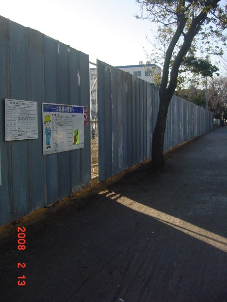 | 2008.2.13 要望し続けていた「中が見える仮囲い」が突然付けられた。 北側に3箇所。プラスチック製。 |