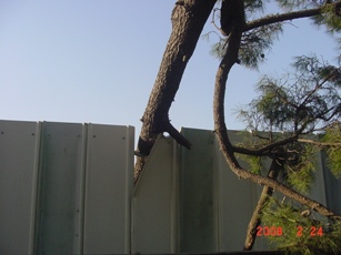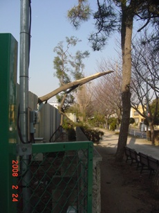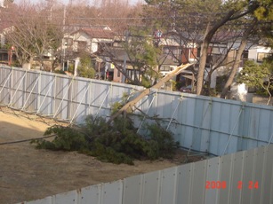 | 2008.2.23 この日吹いた「春一番」で、マラソン道路の松の木が折れました。 折れた先は建設現場のフェンスを壊して敷地内へ。 歩道側に倒れなくて良かった。 |