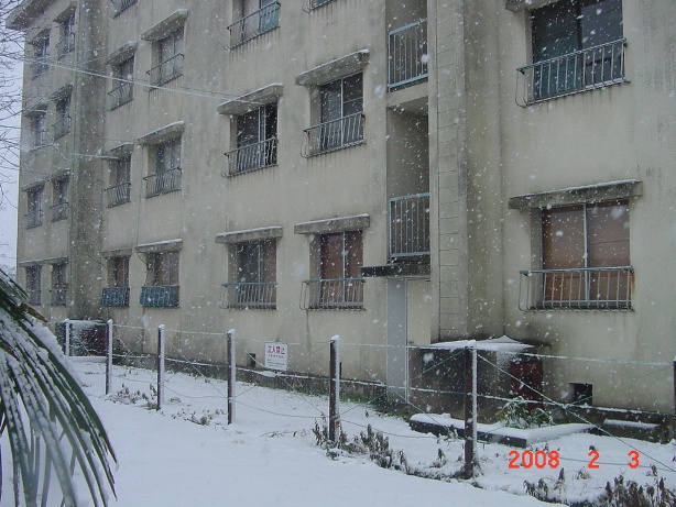 | 2008.2.13 透明囲いを通して撮った画像。 奥の白い建物は廃屋になっている3棟の 旧・教職員住宅 |